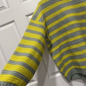 Features: Soft knit fabrication, ribbed trim, drop-shoulder sleeves, striped design allover
