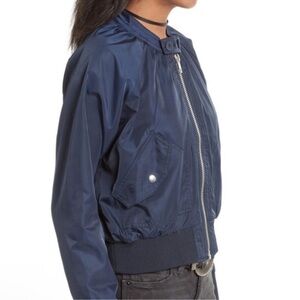 FREE PEOPLE MIDNIGHT BLUE BOMBER JACKET! Zip closure . Snap buttons. Silver accents! Satin! It’s such a great piece!! Impeccable quality’ excellent condition!!! S