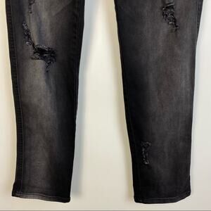 Free People Mountaineer jeans in Distressed Black. Factory distressed and fading. Exposed button fly. Front patch pockets. Back flap pockets. Relaxed fit. Size 4. Excellent used condition. No flaws detected. Please check measurements provided for fit.