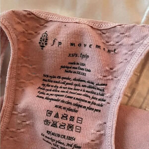 Free People Movement Ribbed High Neck cropped Tank in blush marbled shade. Size XS/S extra stretchy material, cropped. Has small cutout details in the pattern from bust down. Racer back with FP movement logo on back. Great condition barely used & offers welcome!