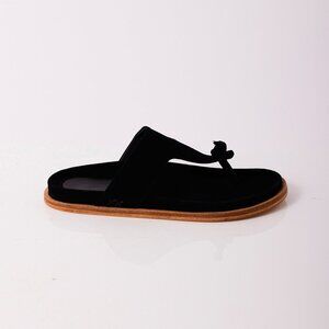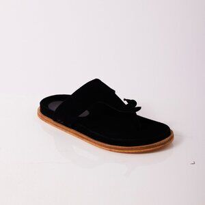 ▪ Features: Slip-on style, backless design, suede uppers, knotted toe detail, thick thong straps, cupped footbed, flat outsole