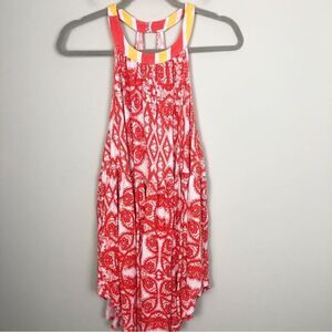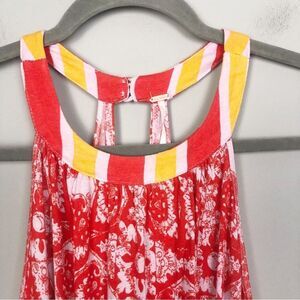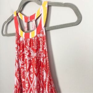 Super cute printed halter style tunic by Free People. Lavender combo is the official color name. Base is a pinkish purple with red-orange print and yellow stripe neckline. Large keyhole back with button closure. Linen blend. Sleeveless. Flowy and oversized. Great condition! Womens size medium.