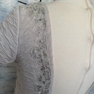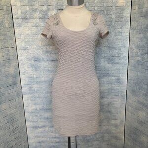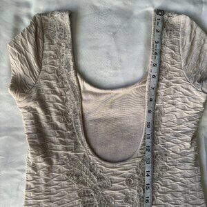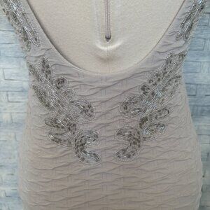 A textured mini dress from Free People in a light beige hue. This fitted dress features short sleeves and a scoop neckline adorned with intricate silver beading on the shoulders. The back boasts a deep scoop with complementary beaded embellishments, adding a touch of glamour. The unique textured fabric creates a flattering, body-hugging silhouette. Perfect for a night out or a special occasion.