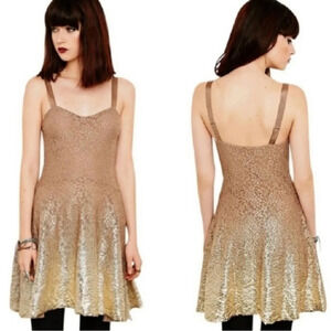 FREE PEOPLE Mocha Ombré Gold Foil Embroidered Tank Skater Dress SM Lined CLEAN