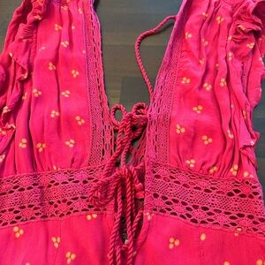 So sweet and essential, this timeless romper is featured in a printed, tie-front silhouette with crochet trimming and ruffled sleeves for added dimension.