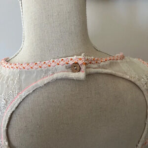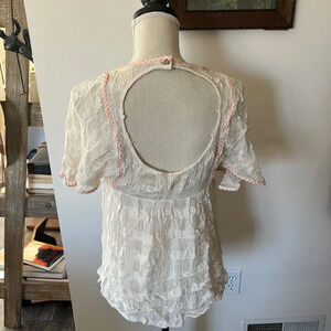 Beautiful off-white knit top with floral embroidery, size XS. Flowy sleeves with pretty piping. Large keyhole in back. Good pre-loved condition, is a very delicate shirt so there may be a few loose threads, nothing too noticeable!