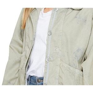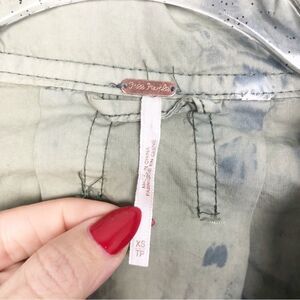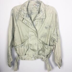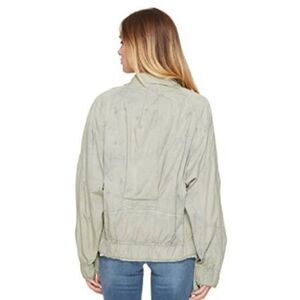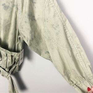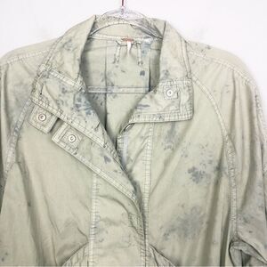 Cute ultra lightweight parachute style jacket by Free People. Green with all over blue distressing effect. Button and snap front closures. Slouchy. Front pockets. Elastic cuffs. Buckle detailing at the bottom. Brand NWT! Womens size extra small (XSmall).