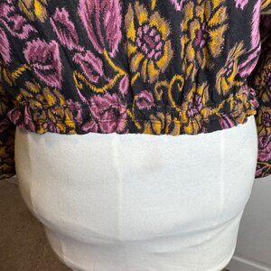 Purple and black floral, raw edges, cropped, tie back, 100% cotton, puff sleeves, low back, elastic waist, pit to pit 21”, length 18”