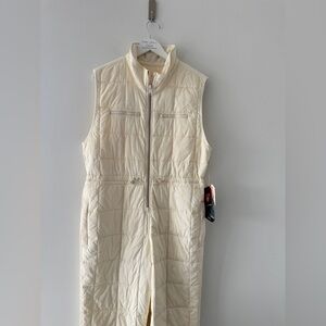 Your favorite packable puffer now in a winter-ready full-length suit. This quilted one-piece features a sleeveless silhouette and front-zip closure with adjustable bungee cords at the waist.