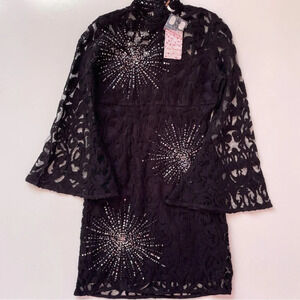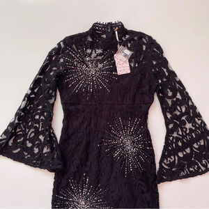 FREE PEOPLE North Star Black Lace Bell Sleeve Sequin Mini Dress Size 0