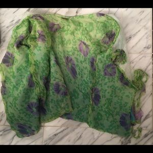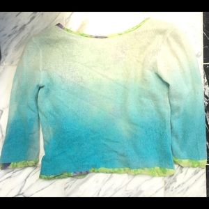 FREE PEOPLE SWEATER, THE COLORING IS A OMBRÉ ALMOST WHITE TO A PRETTY BLUE, NO TAGS, NOT SURE FABRIC, FEELS LIKE ANGORA MIX, AND DELICATE LINING OF GREEN AND PURPLE FLOWERED PATTERN