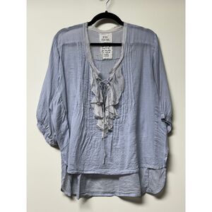 100% cotton with 100% silk ruffle detail. Pintuck in the front and back. 3/4 sleeves. Lace up front. High/low design. Like most Free People, this top is oversized.