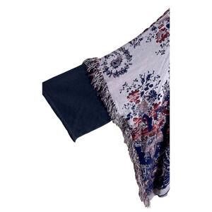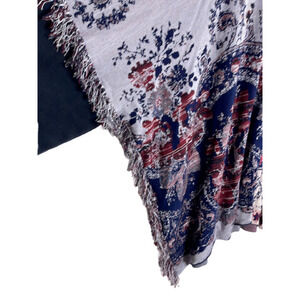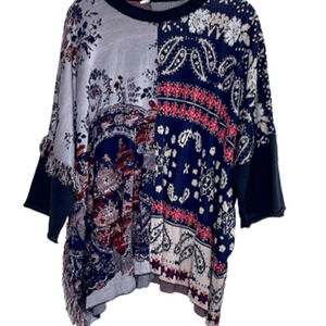 FREE PEOPLE OVERSIZED BOHO PIECED PAISLEY FRINGE TUNIC TOP SIZE M/L.Draped tunic looks like poncho Oversized construction, Crewneck, Contrast three-quarter sleeves, Fringed trim .65% rayon, 23% cotton, 8% viscose, 4% linen. Pre-owned exellent condition. pit to pit 36", length 28.5".