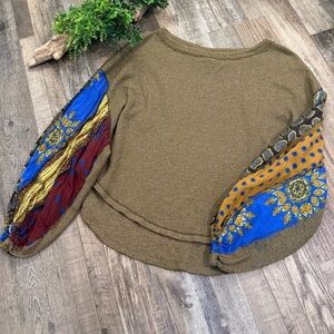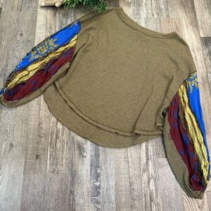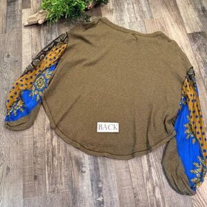 FREE PEOPLE Olive Oversized Waffle Knit Top with Colorful Billow Sleeves Size M