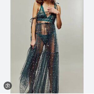 FREE PEOPLE One Estella Sheer Mesh Glitter Maxi Slip Dress Size S/P teal glitter