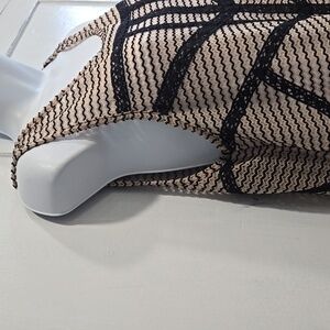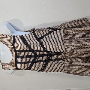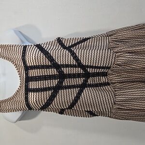 Tan and black sleeveless tunic.. peplum ruffle.. pull over.. scoop neck.. black lace trim embellishments..