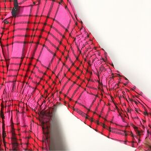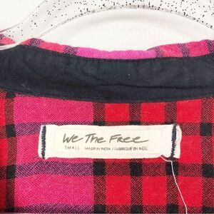 Super cute red and pink and black plaid flannel shirt by We the Free for Free People. Snap front. Ruched long sleeves with ties. Cinched waist with peplum style bottom. Raw edge hem. Great condition. Womens size small.