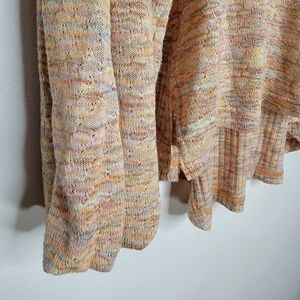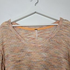 Effortless and romantic, the Free People Happy Day Knit Top, blends bohemian ease with cozy sophistication. Featuring a soft honeycomb rib knit in Pastel Dream—a mélange of pastel orange, heathered blue, white, and tan—this oversized silhouette drapes beautifully for all-day comfort