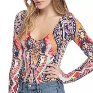Printed long sleeve bodysuit with a sultry front criss-cross design.