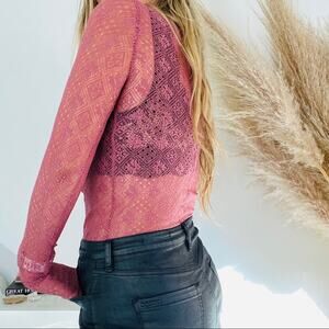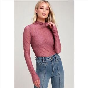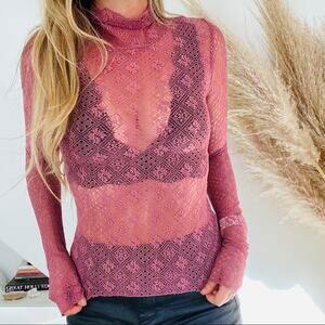 FREE PEOPLE Pink Mauve Blush Lace Sheer Long Sleeve Turtleneck Shirt Top Blouse
