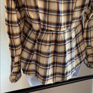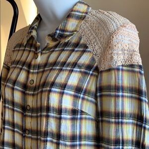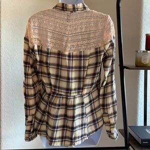 FREE PEOPLE Plaid Crochet Peplum Snap Button down