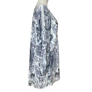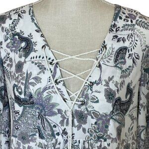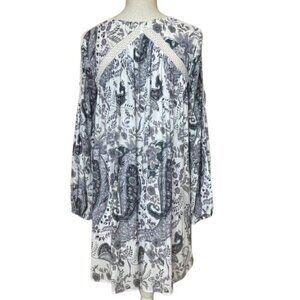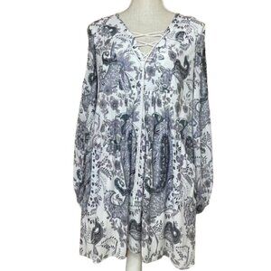 In a shapeless, swingy silhouette, this effortless printed mini dress is perfect for anything! Paired with leggings or jeans it could be worn as a long tunic top. Lace-up detailing on the neckline, crochet trim, and elastic band on the cuffs makes this a bohemian dream.