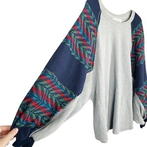 This knit sweater from We The Free collection features dramatic puff sleeves and pattern piece detailing on the sleeves in an oversized silhouette. Unfinished hem. Scoop neck. Dramatic sleeves