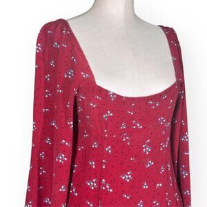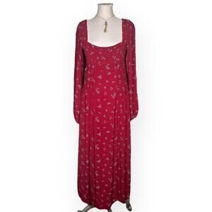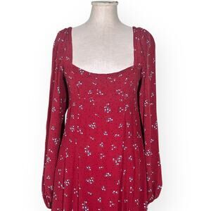 FREE PEOPLE Red Midi IRIS Dress Smocked Square Neck Puff Sleeve Cottagecore S