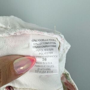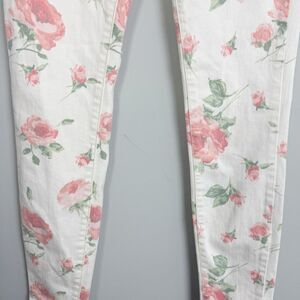 Gorgeous rose floral print jeans by free people. Midrise. Zipper and button closure. Pockets and belt loops. Off-white base with flowers in the shades of pink and green. Slim straight leg. Great condition. Women’s size 26 waist.