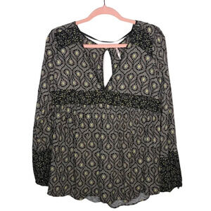 FREE PEOPLE • “Rolling Hills” Split Bell Sleeve Floral Boho Woven Blouse. Deep V Neck, Keyhole Back. Empire Waist.