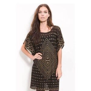 Excellent condition. Black/gold printed. Geometric Aztec knit. Tunic length. Poncho sleeves. Lightweight mesh fabric. Round neck.