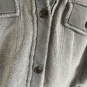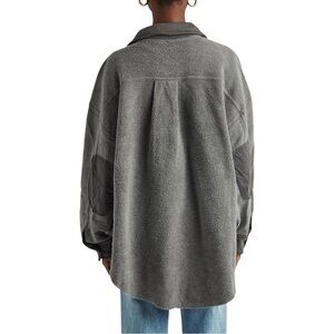 FREE PEOPLE Ruby Jacket Oversized Shirt Shacket. Front button closure. Breast flap pockets with button closure. Side slant pockets. Elbow patches with raw-cut trim. Buttoned cuffs. Fleece-like fabric with faded and distressed jersey contrast fabric. Oversized.