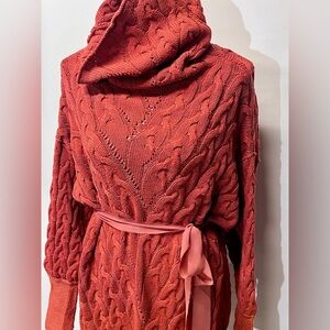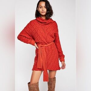 Rust red cable knit turtleneck sweater dress from FREE PEOPLE, size S. Dress has long sleeves and was missing original sash but I replaced it with what’s shown.