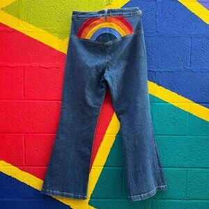 Add a touch of color to any look with these so fun flare jeans, featuring a rainbow design at the back with an exaggerated yoke seam for a bold, statement-making design. High-rise silhouette Side pockets Zip-fly and button closure Soft, stretch denim.