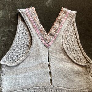 Free People/ SP/ Sleeveless/MIDI Dress/ Body Con- Form Fitting/ Deep V Neckline/Beige Color/ Embellished Neckline front and back and goes down front of dress/ small back cut outs/ Wool Acrylic and Nylon/ measurements pictured . This dress is a SHOW STOPPER. Pre-owned BY ME and in excellent condition! Please see pictures