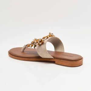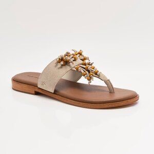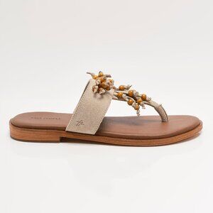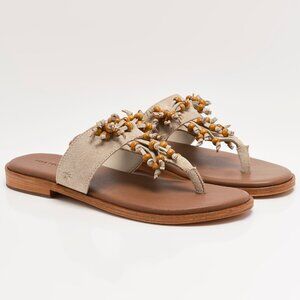 Slip into this playful pair of embellished sandals, featured in a metallic leather fabrication with beautiful beading throughout and thong-style toe feature for the perfect finishing touch.