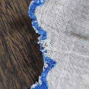 As seen in pictures blue stitching missing on a couple areas sleeves, but hard to notice when wearing.