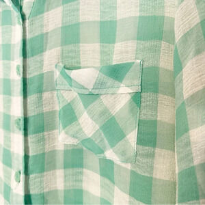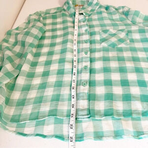 FREE PEOPLE Semi Sheer Gingham Blouse Button Up Top Green White High Low Small