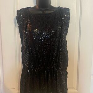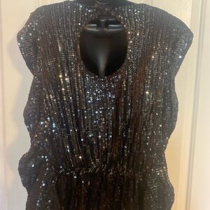 Black sequin tunic type top with an elastic waist. Cinched elastic waist with a peplum like hemline. Cap type short sleeves with flutter edge finish. Big keyhole in back of neck. Pull on style.