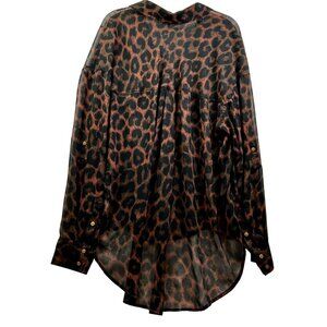 FREE PEOPLE Sheer Leopard Animal Print Button-Up High-Low Long Sleeve Blouse L