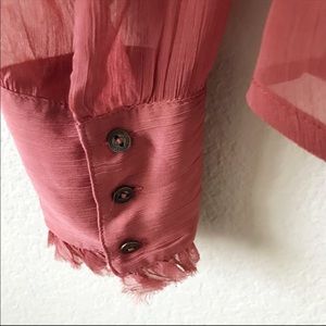 Sheer chiffon blouse with ruffle-front detailing a la tuxedo shirts. Sleeves are a little billowy and have button closure detailing. Super cute, great with a cami or bralette underneath. Color is a pink-forward mauve.