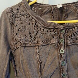 FREE PEOPLE Shell Lace Henley T-shirt Top XS Wine Scoop neck Gold Coast LS