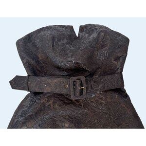 Nice cocktail dress by Free People. Black strapless. Textured, jacquard print. Wire V neckline. No slip bust band. Adjustable / removable belt. Hidden side closure. Lined. 8% metallic, 37% polyester, 55% cotton. Tag is a size 12. Listed as a size 10 b/c it runs small. See measurement diagram in photo section. Pre-owned and gently worn in really nice condition!