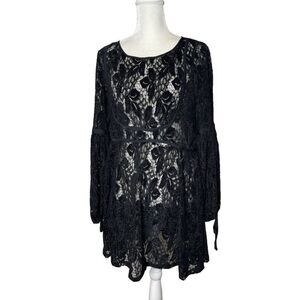 FREE PEOPLE Size M Ruby Black Lace Mini Dress Long Sleeve Sheer Fit Flare