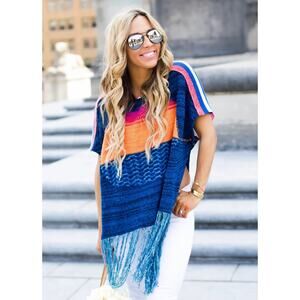 FREE PEOPLE Size XS Sunset Fringe Sweater Poncho Style Loose Fit Bohemian Festival. Cotton blend. Excellent pre-owned condition. No stains or rips.