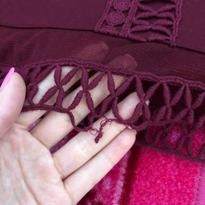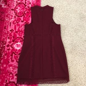 Worn once. Mini dress with high neck and mesh and lace details. Maroon color. Got the bottom hem caught on something (shown in second photo). Otherwise excellent condition.