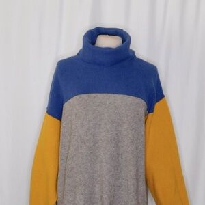 Fold-Down turtleneck style neckline ~ Long sleeves with dropped shoulder seams ~ Straight hemline ~ Oversized fit ~ Pullover styling ~ Soft unlined knit fabric … fabric does have stretch ~ Fabric has a light ribbed texture ~ Colorblock design in blue, yellow and heathered brown colors