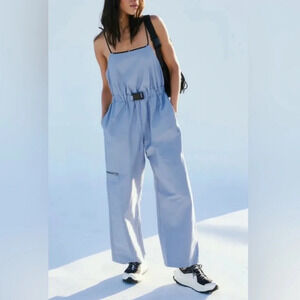 Features: Nylon fabrication; relaxed leg; bungee neckline and adjustable straps; elasticated waistband with buckle belt closure; open back; on-seam side pockets and zipped cargo pocket