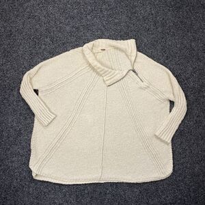 The FREE PEOPLE Sweater is a stylish and cozy women's twirl all around oversized poncho pullover in size XS/S. This marled beige sweater features a chunky-knit design with long sleeves and a round neckline. Made from acrylic material, this relaxed fit sweater is perfect for a comfortable and fashionable look. The zip closure and raglan sleeves add unique details to this pullover, making it a versatile and chic addition to any woman's wardrobe.