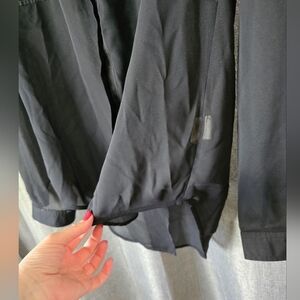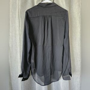 Elegant black sheer blouse with button-up front and chest pocket. Perfect for any occasion.